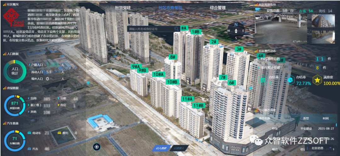 平臺以空間大數(shù)據(jù)平臺為依托,形成全面覆蓋社區(qū)管理與服務(wù)的二三維一張圖,可視化展現(xiàn)社區(qū)人口、房屋、車輛、安防、黨建活動、事件等實(shí)時狀態(tài),輔助管理者直觀了解和掌握社區(qū)的整體情況,做到一圖盡覽。